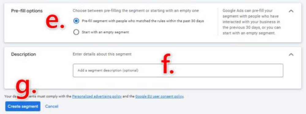 e)Pre-fill options — Allow Google to populate this segment with users who have interacted with your website in the last 30 days (Default). Otherwise, you can start with an empty segment. f)Description – Enter details about the segment. This is optional. g)Create Segment — Click to complete this audience segment.