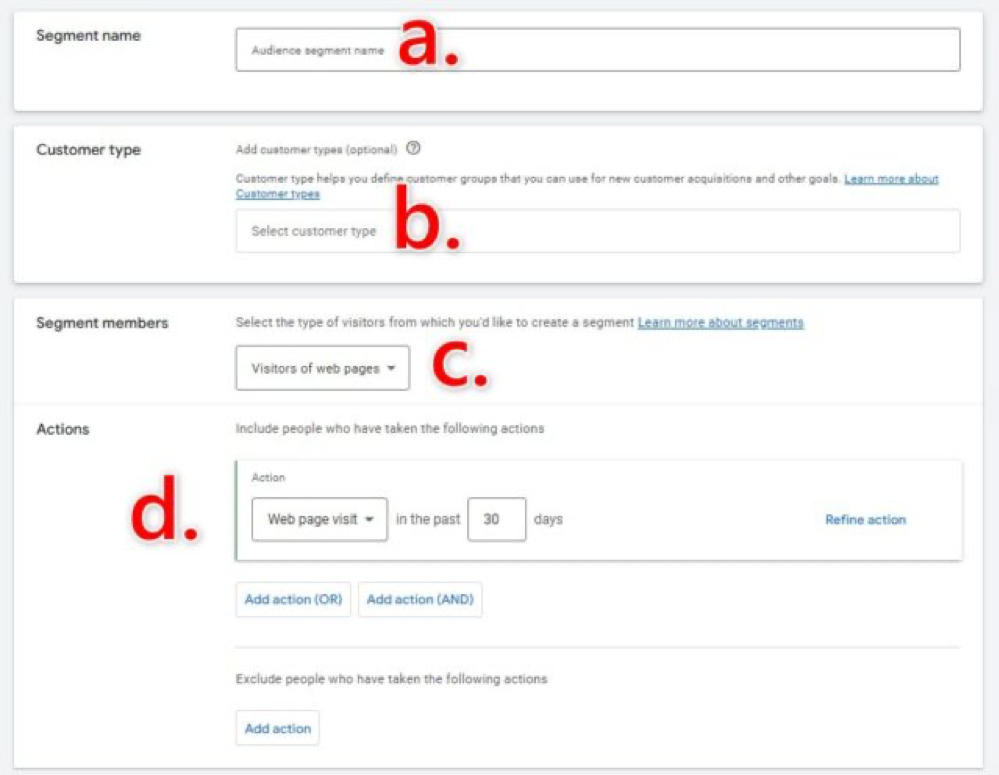 b) Customer type – Define your customer group to reach the objective of your campaign. c)Segment members — Select the type of users who have interacted with your website. d)Actions — The “Actions” section is where you create a set of rules for what should happen with a particular group of people.