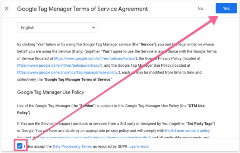06▸ You’ll see a Google Tag Manager Terms of Service pop-up. Select the checkbox and click “Yes”.