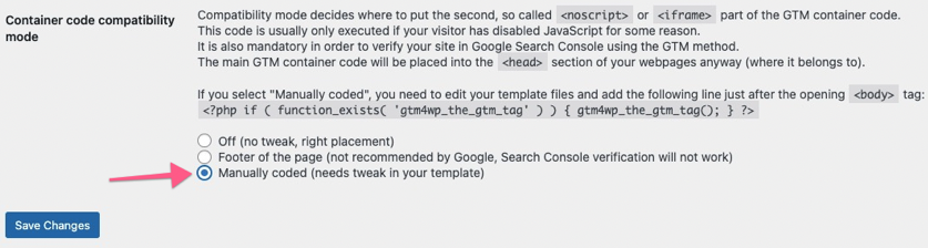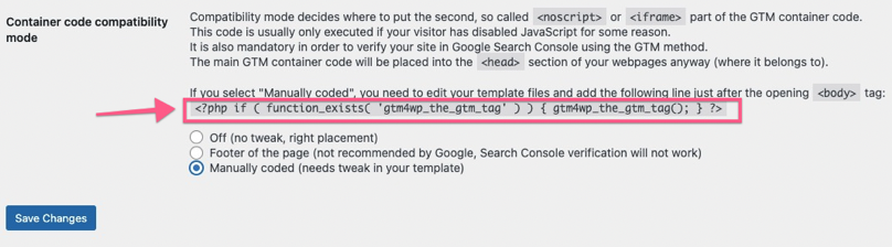 - Option 2: Manually Coded — with this option, you will need to make a small edit to your theme files. If your WordPress theme allows you to make changes and you’re comfortable with the theme editor, you can use this option. Select the “Custom (needs a tweak in your template)” container code placement and click on “Save Changes.”